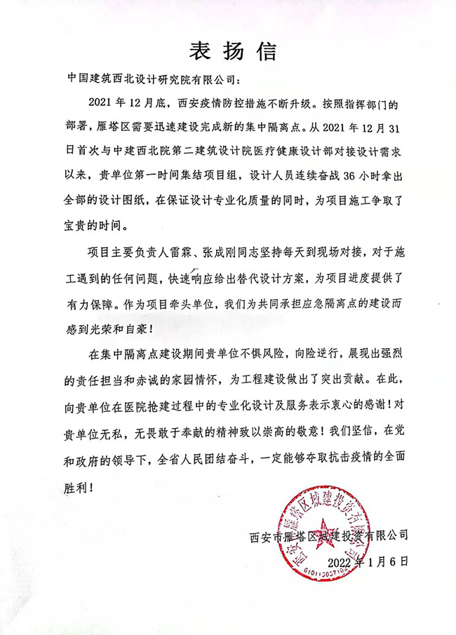 1月6日21:00,西安雁塔區(qū)二號醫(yī)學(xué)隔離點項目全面建成中國建筑西北設(shè)計研究院收到表揚信。