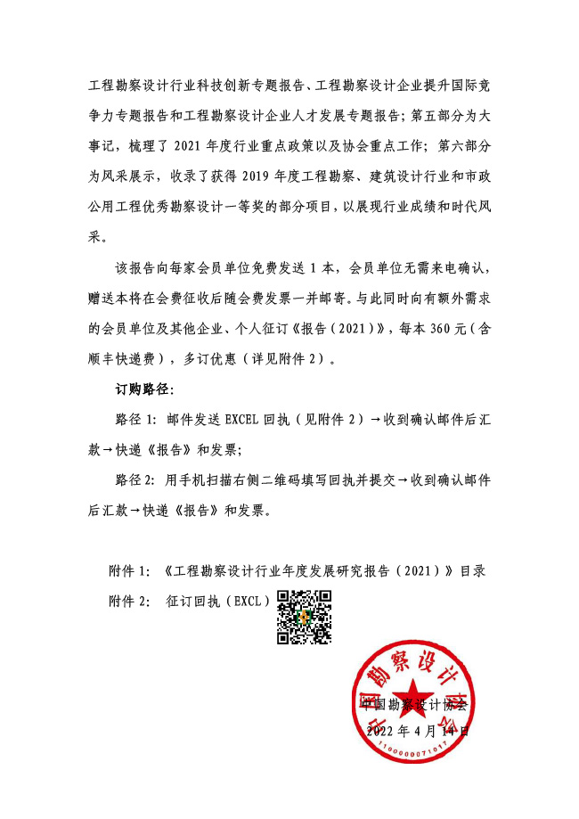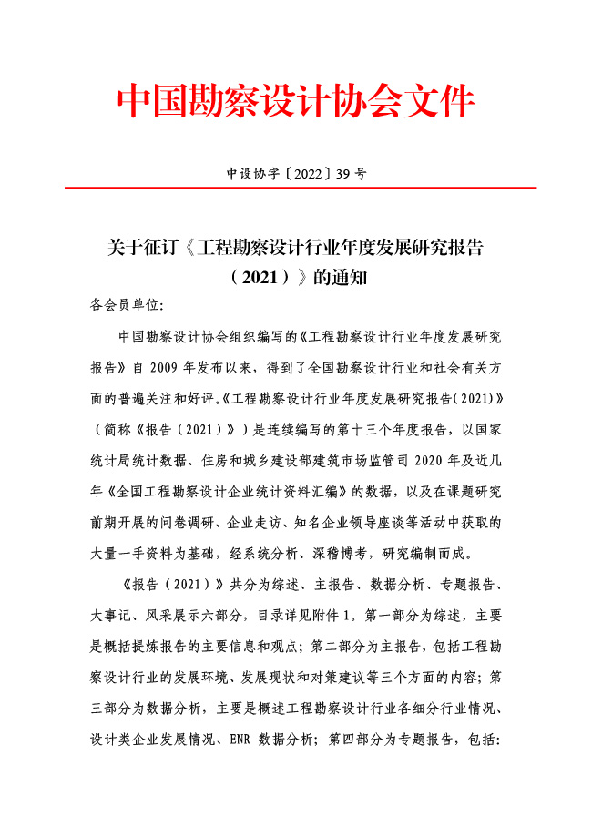關(guān)于征訂《工程勘察設(shè)計(jì)行業(yè)年度發(fā)展研究報(bào)告(2021)》的通知 中設(shè)協(xié)字〔2022〕39號(hào)