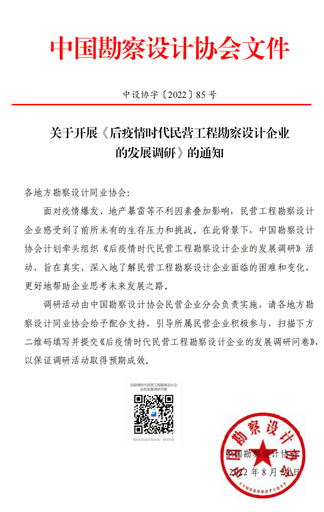 關(guān)于開展《后疫情時(shí)代民營(yíng)工程勘察設(shè)計(jì)企業(yè)的發(fā)展調(diào)研》的通知 中設(shè)協(xié)字〔2022〕85號(hào)