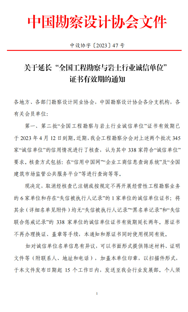 關(guān)于延長(zhǎng)“全國(guó)工程勘察與巖土行業(yè)誠(chéng)信單位”證書(shū)有效期的通知 中設(shè)協(xié)字〔2023〕47號(hào)