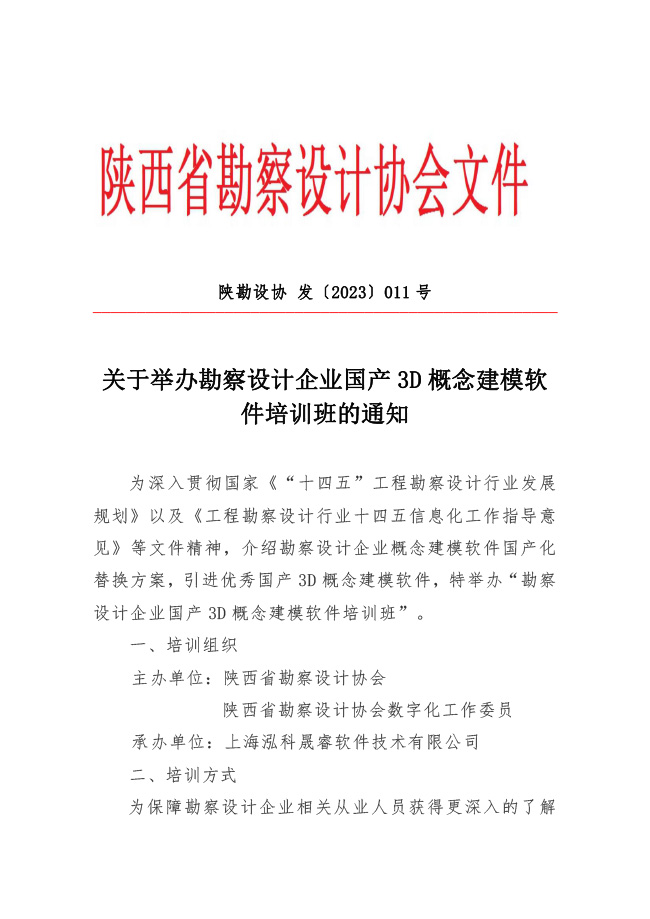 陜勘設(shè)協(xié)〔2023〕011號 關(guān)于舉辦勘察設(shè)計企業(yè)國產(chǎn)3D概念建模軟件培訓(xùn)班的通知