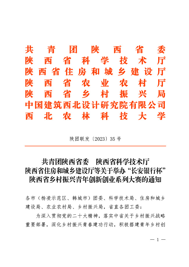 陜團(tuán)聯(lián)發(fā)〔2023〕35 號(hào) 關(guān)于舉辦“長(zhǎng)安銀行杯” 陜西省鄉(xiāng)村振興青年創(chuàng)新創(chuàng)業(yè)系列大賽的通知