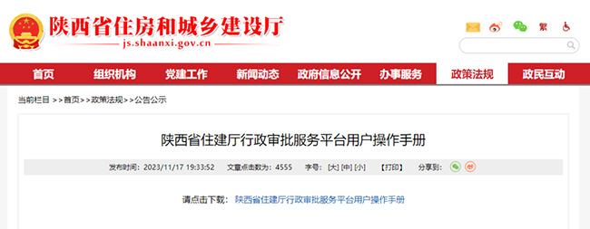 2023年11月17日陜西省住建廳發(fā)布了《陜西省住建廳行政審批服務(wù)平臺用戶操作手冊》。