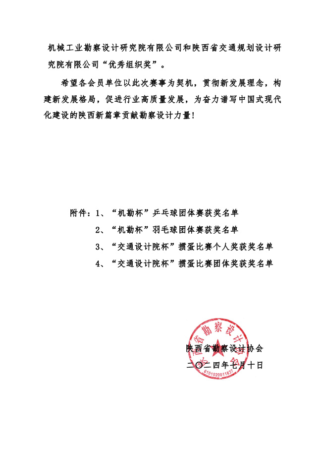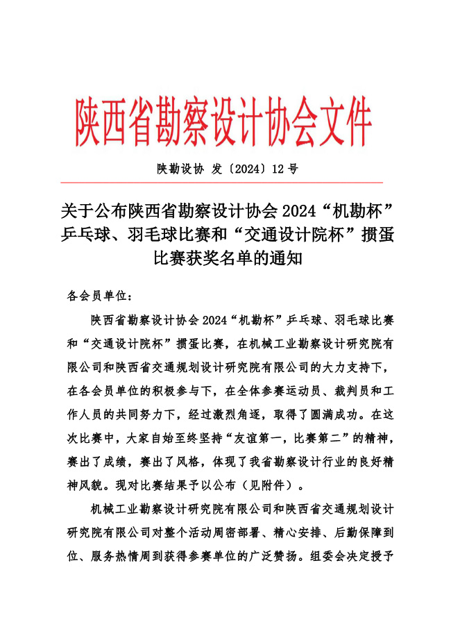 關(guān)于公布陜西省勘察設(shè)計(jì)協(xié)會(huì) 2024“機(jī)勘杯” 乒乓球、羽毛球比賽和“交通設(shè)計(jì)院杯”摜蛋比賽獲獎(jiǎng)名單的通知