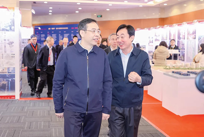 住房城鄉(xiāng)建設(shè)部黨組成員、副部長王暉(左)與中國勘察設(shè)計(jì)協(xié)會(huì)理事長朱長喜(右)參觀大賽成果展
