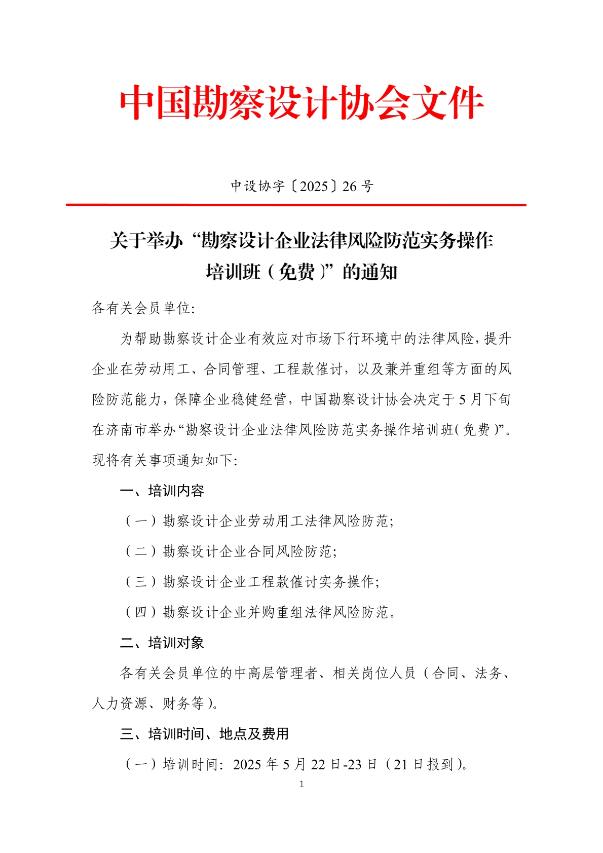 中設(shè)協(xié)字〔2025〕26 號(hào):關(guān)于舉辦“勘察設(shè)計(jì)企業(yè)法律風(fēng)險(xiǎn)防范實(shí)務(wù)操作培訓(xùn)班(免費(fèi))”的通知