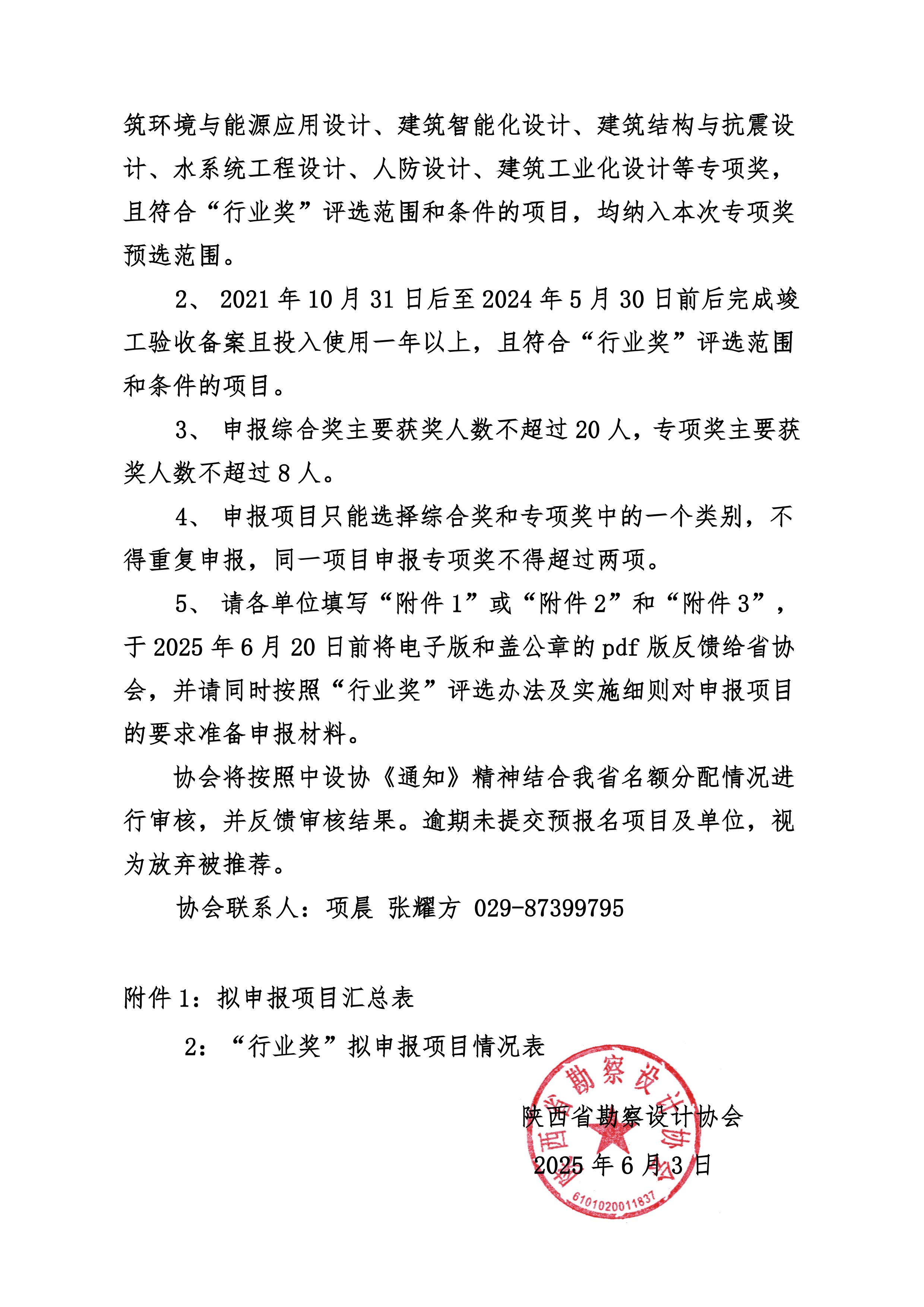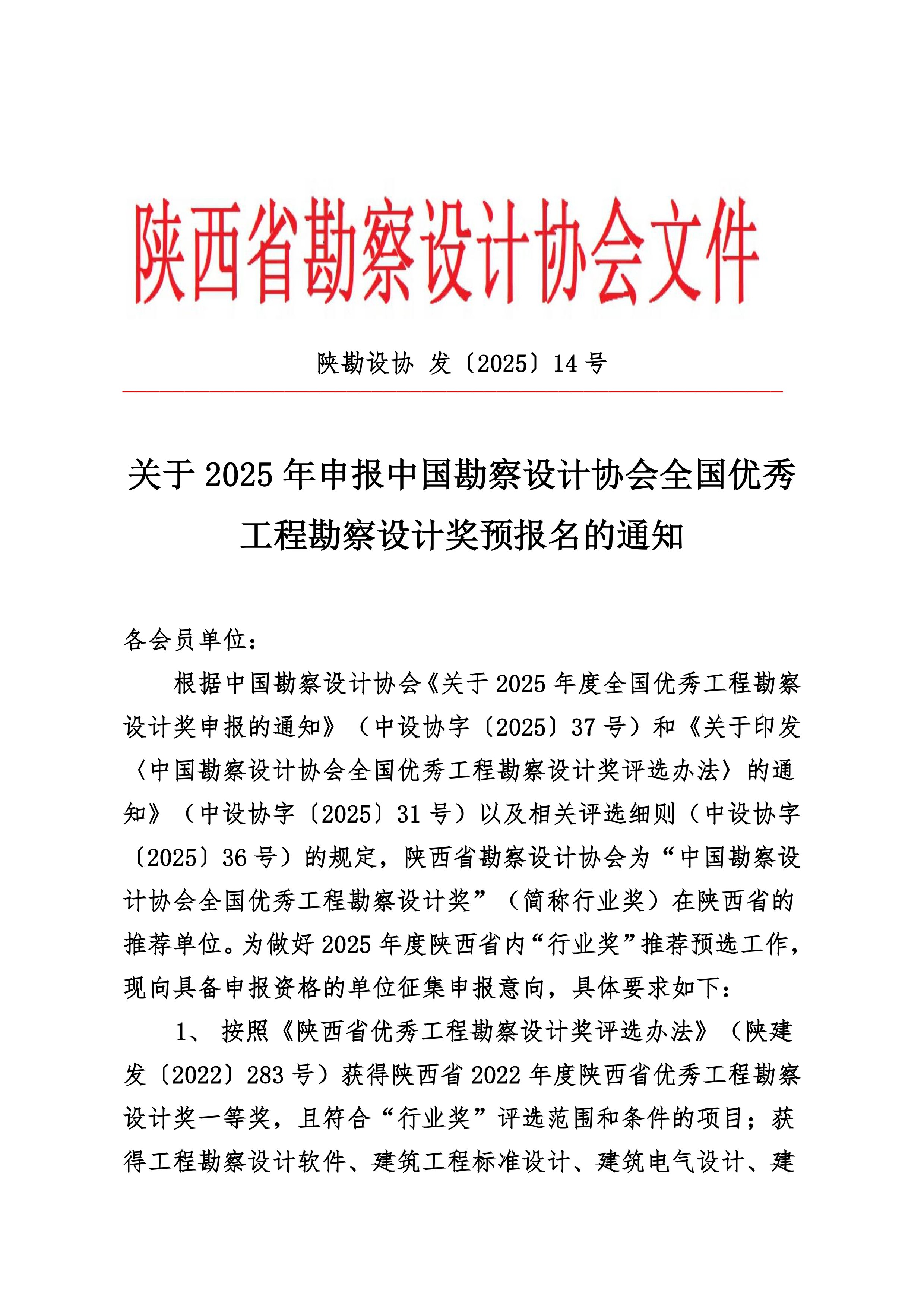 陜勘設(shè)協(xié) 發(fā)〔2025〕14 號 關(guān)于 2025 年申報中國勘察設(shè)計協(xié)會全國優(yōu)秀工程勘察設(shè)計獎預(yù)報名的通知