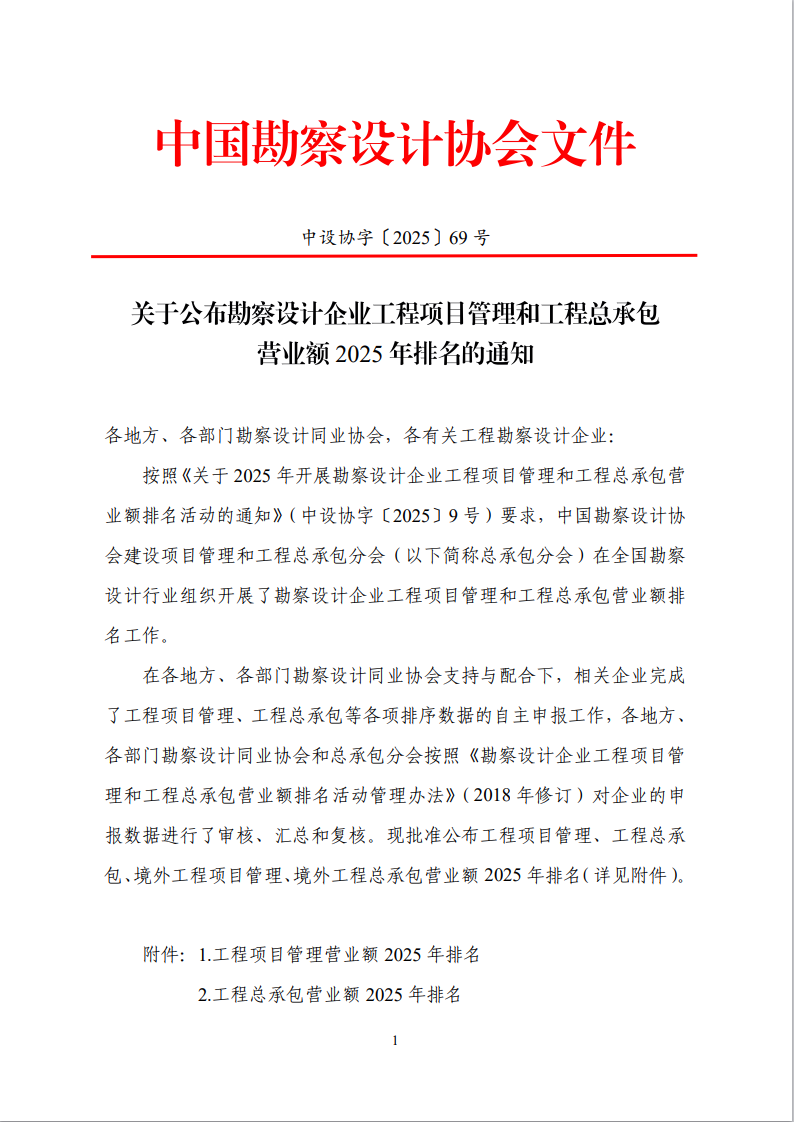 紅頭文件及附件下載:中設(shè)協(xié)字〔2025〕69號(hào)關(guān)于公布勘察設(shè)計(jì)企業(yè)工程項(xiàng)目管理和工程總承包營(yíng)業(yè)額2025年排名的通知
