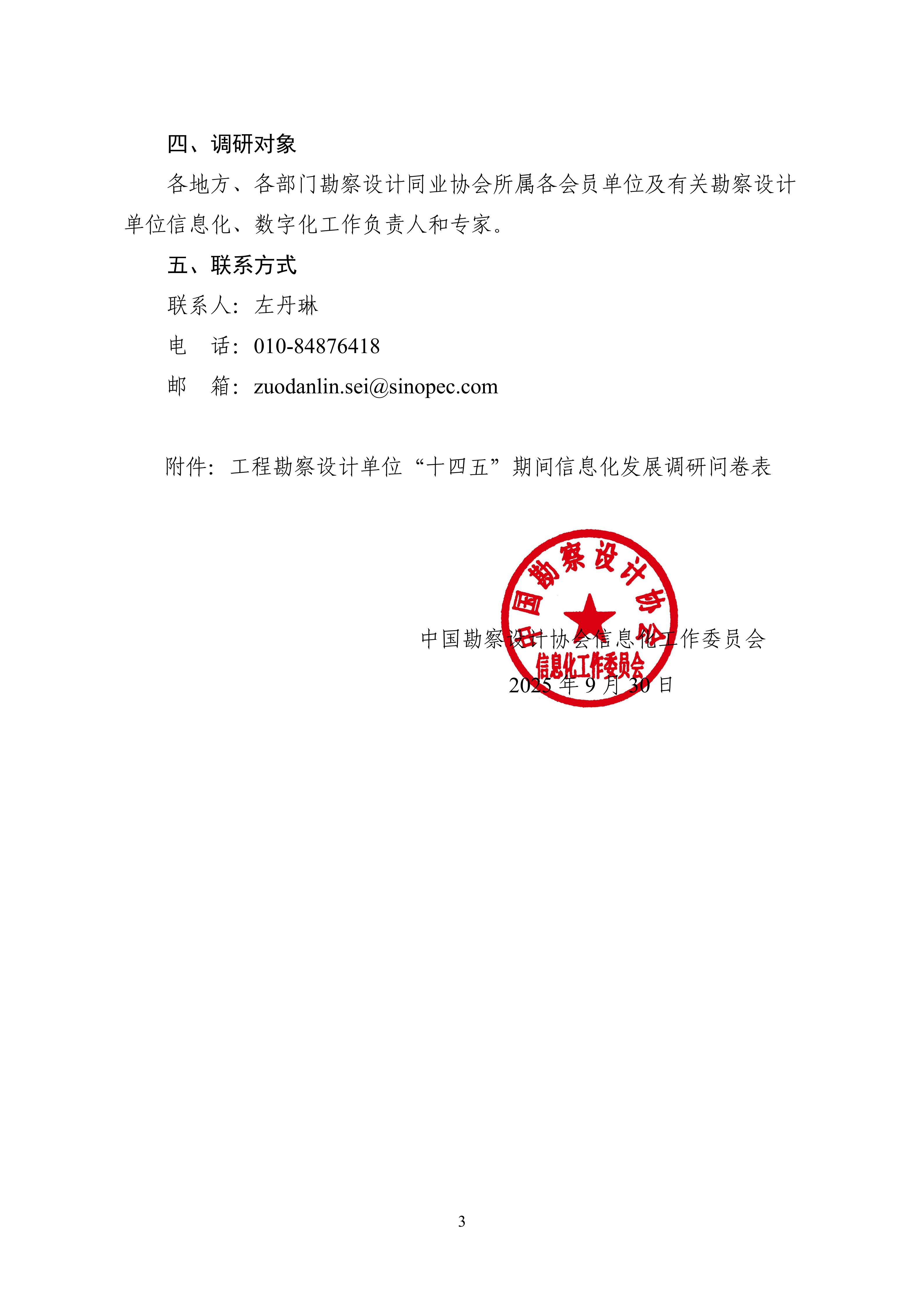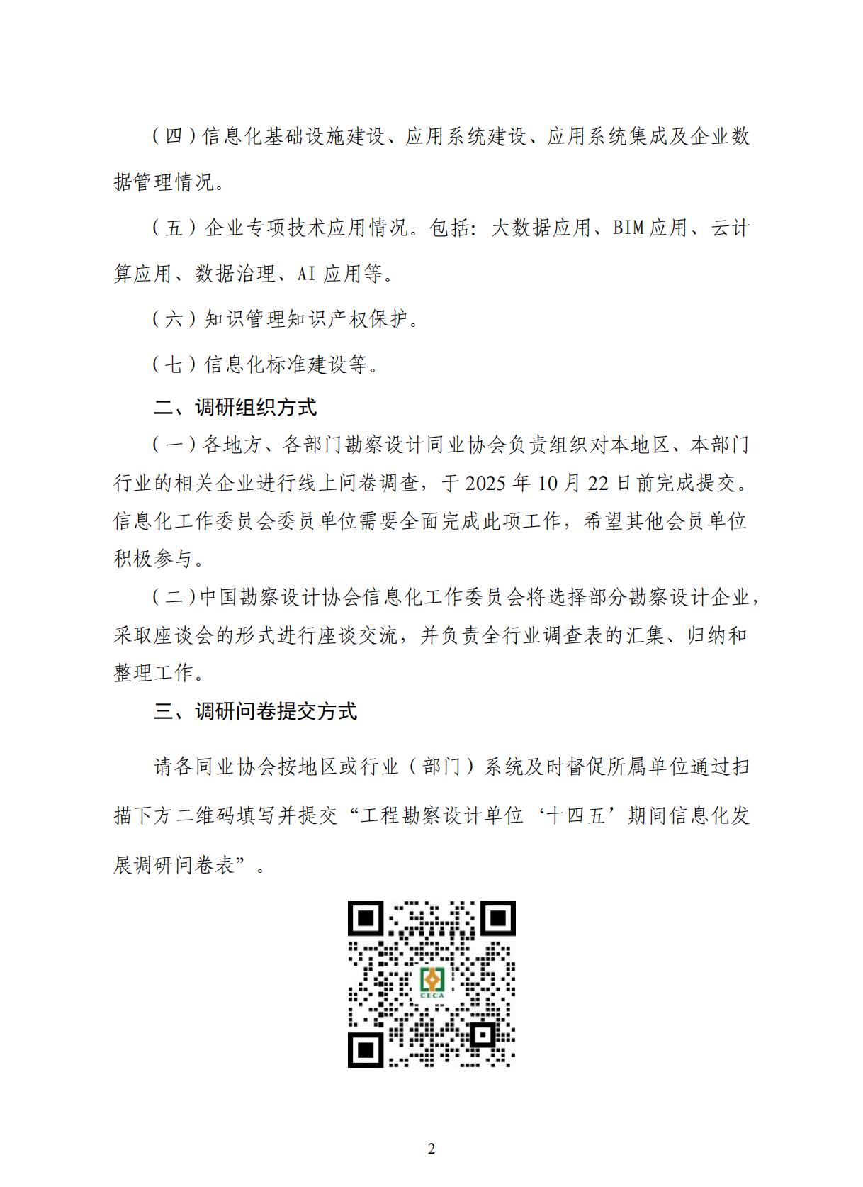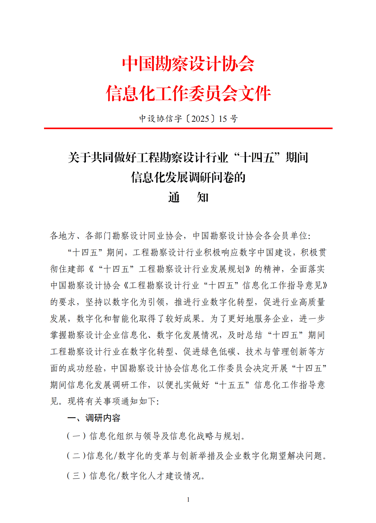 關(guān)于共同做好工程勘察設(shè)計行業(yè)“十四五”期間信息化發(fā)展調(diào)研問卷的通知 中設(shè)協(xié)信字〔2025〕15號