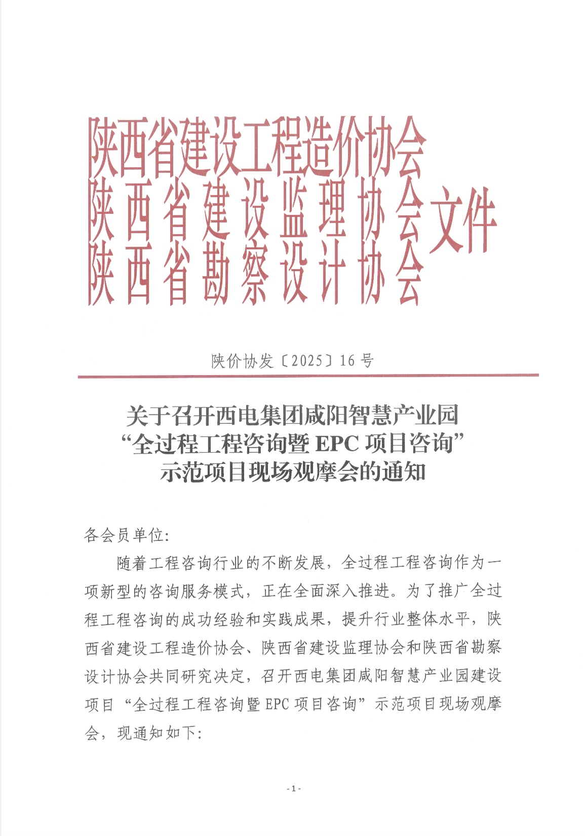 關(guān)于召開西電集團(tuán)咸陽智慧產(chǎn)業(yè)園“全過程工程咨詢暨EPC項(xiàng)目咨詢”示范項(xiàng)目現(xiàn)場觀摩會(huì)的通知