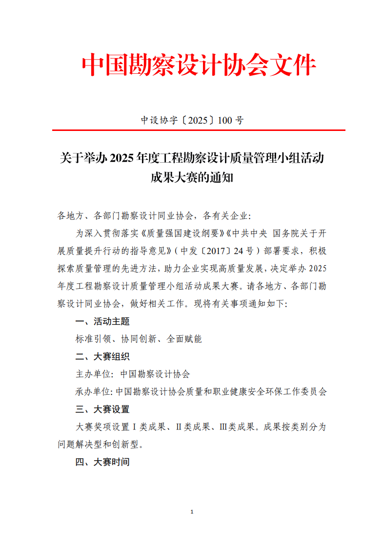 關于舉辦2025年度工程勘察設計質量管理小組活動成果大賽的通知 中設協(xié)字〔2025〕100號