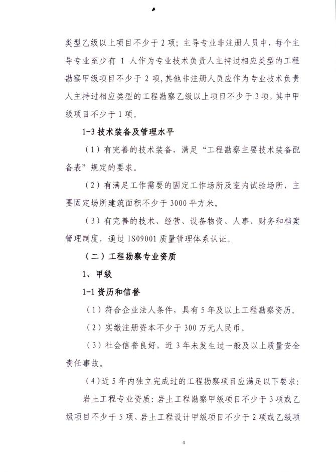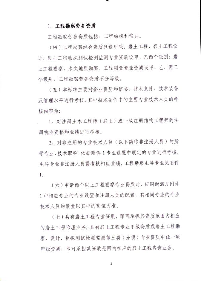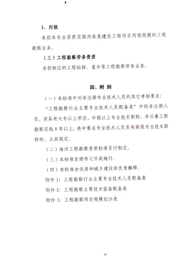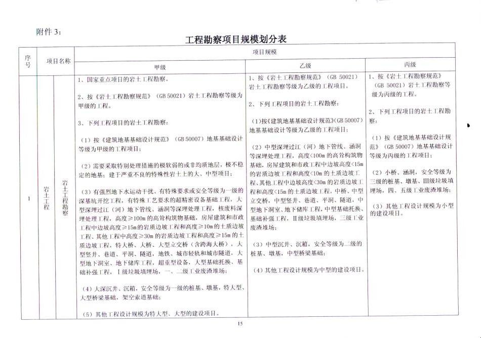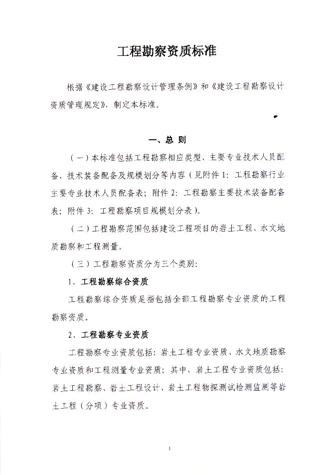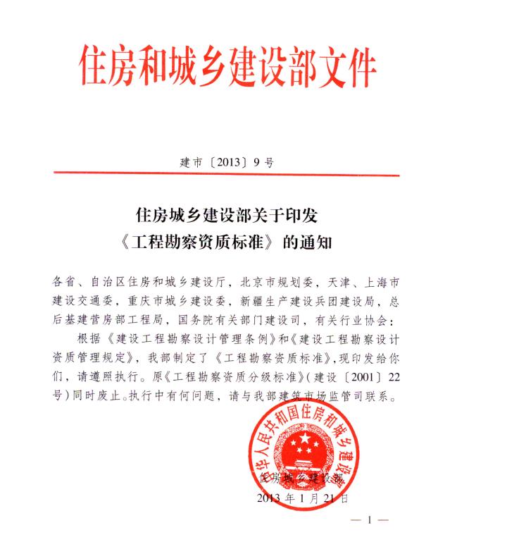根據(jù)《建設(shè)工程勘察設(shè)計管理條例》和《建設(shè)工程勘察設(shè)計資質(zhì)管理規(guī)定》,我部制定了《工程勘察資質(zhì)標(biāo)準(zhǔn)》,現(xiàn)印發(fā)給你們,請遵照執(zhí)行。原《工程勘察資質(zhì)分級標(biāo)準(zhǔn)》(建設(shè)[2001]22號)同時廢止。執(zhí)行中有何問題,請與我部建筑市場監(jiān)管司聯(lián)系。
