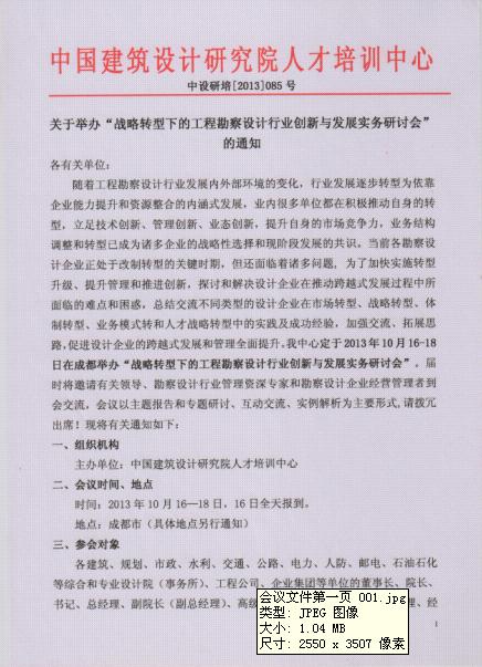 關(guān)于舉辦“戰(zhàn)略轉(zhuǎn)型下的工程勘察設(shè)計行業(yè)創(chuàng)新與發(fā)展實務(wù)研討會”的通知(中設(shè)研培[2013]085號)
