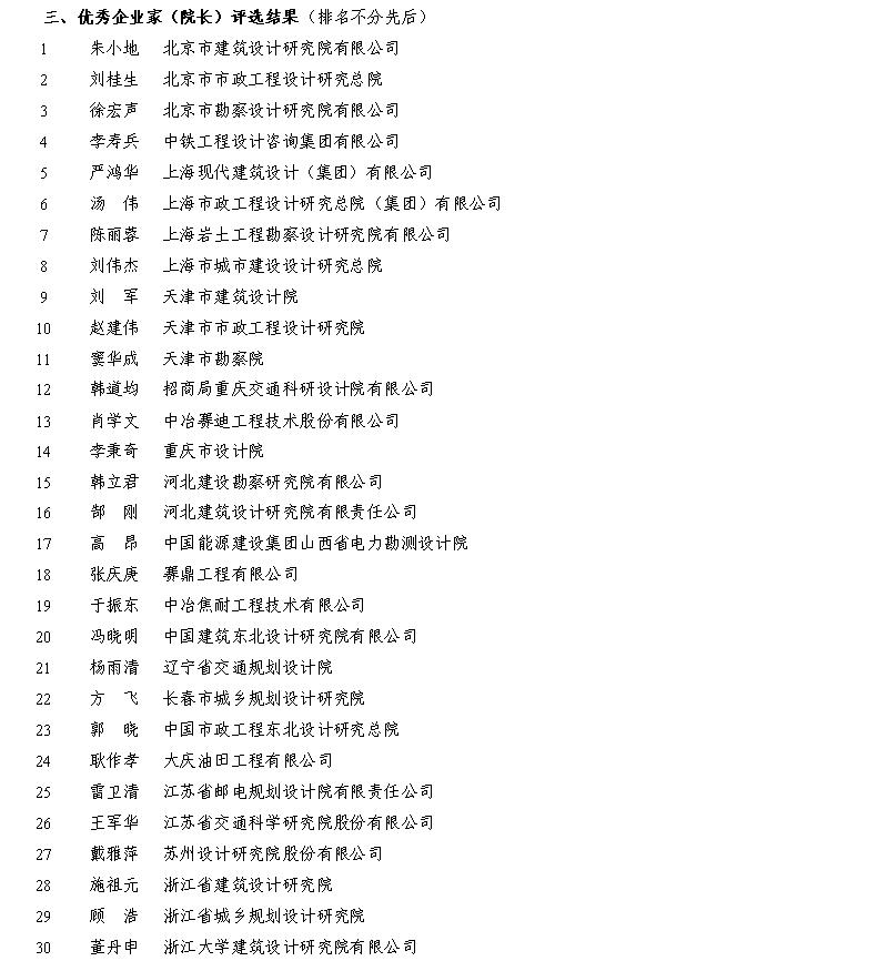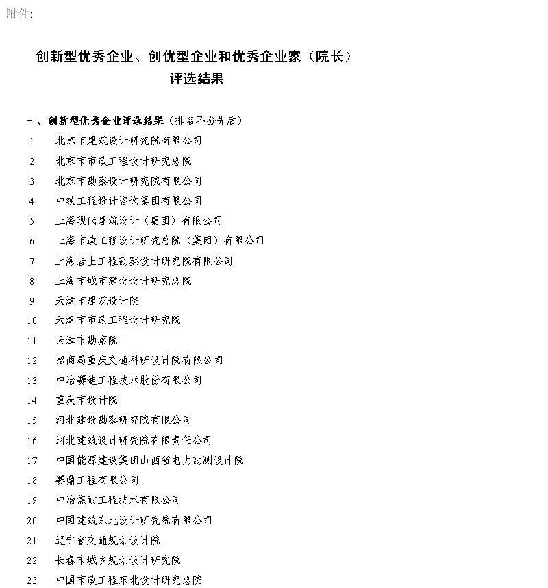 附件:創(chuàng)新型優(yōu)秀企業(yè)、創(chuàng)優(yōu)型企業(yè)和優(yōu)秀企業(yè)家(院長(zhǎng))評(píng)選結(jié)果 中國(guó)勘察設(shè)計(jì)協(xié)會(huì)