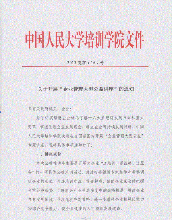 為了切實(shí)幫助企業(yè)詳盡了解十八大后經(jīng)濟(jì)發(fā)展方向和重大變革,掌握先進(jìn)的企業(yè)發(fā)展理念,確立企業(yè)可持續(xù)發(fā)展戰(zhàn)略,中國人民大學(xué)培訓(xùn)學(xué)院決定在全國范圍內(nèi)開展“企業(yè)管理大型公益”專題講座,以下簡稱“公益講座”。公益講座主要是開展為企業(yè)“送培訓(xùn)、送戰(zhàn)略、送服務(wù)”的一項(xiàng)不收取任何培訓(xùn)費(fèi)用的公益培訓(xùn)活動,現(xiàn)將參加公益講座程序說明如下: