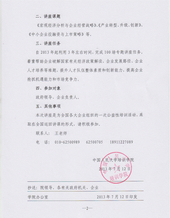 提交《參加公益講座申請表》,需加蓋組織推薦方公章,以傳真或郵件方式發(fā)送至學(xué)院公益講座小組(傳真:010-62500705,郵箱:rendapeixun01@163.com,聯(lián)系方式18911227089/010-62500989)。