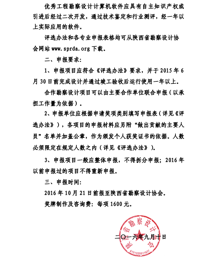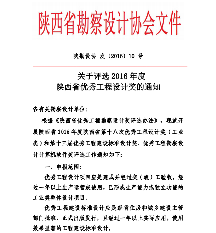 關(guān)于評選2016年度陜西省優(yōu)秀工程設(shè)計獎的通知