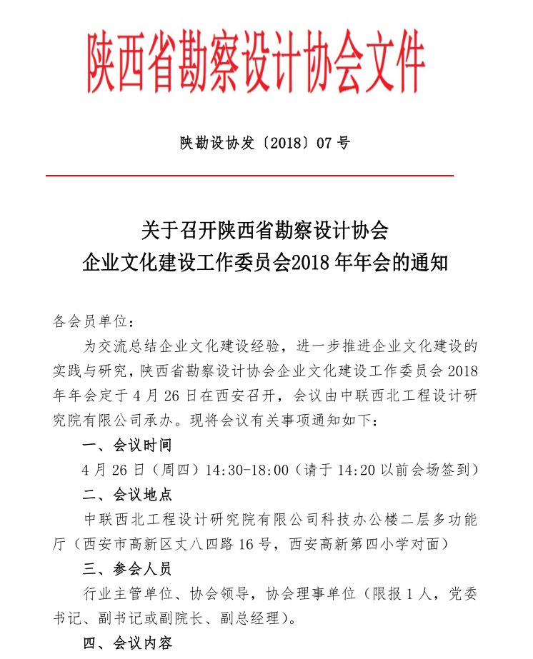 關(guān)于召開陜西省勘察設(shè)計(jì)協(xié)會(huì)企業(yè)文化建設(shè)工作委員會(huì)2018年年會(huì)的通知