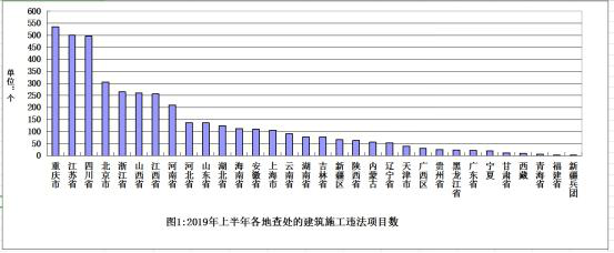 從各地查處的違法工程項(xiàng)目數(shù)量看,重慶、江蘇、四川3省(市)查處力度較大,分別查處項(xiàng)目535個(gè)、500個(gè)、496個(gè)(見圖1)。