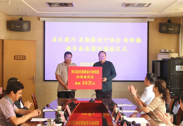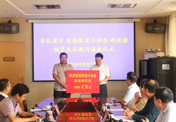 縣政府辦負(fù)責(zé)人介紹了洛南縣在“8.6”洪水災(zāi)害中的受災(zāi)情況以及災(zāi)后恢復(fù)重建情況。院長(zhǎng)燕建龍代表我院向縣紅十字會(huì)捐款30萬(wàn)元,省勘察設(shè)計(jì)協(xié)會(huì)理事長(zhǎng)張文亮代表協(xié)會(huì)捐款2萬(wàn)元。