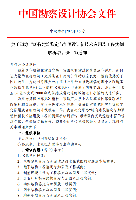 關(guān)于舉辦“既有建筑鑒定與加固設(shè)計(jì)新技術(shù)應(yīng)用及工程實(shí)例解析培訓(xùn)班”的通知