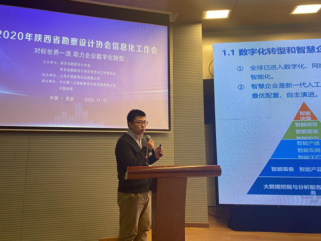天強管理顧問副總經(jīng)理趙月松首先做《設(shè)計院數(shù)字化轉(zhuǎn)型趨勢與數(shù)字化戰(zhàn)略設(shè)計》的主題報告,介紹了企業(yè)在數(shù)字化轉(zhuǎn)型過程中面臨的問題與困惑,以及未來推進(jìn)數(shù)字化轉(zhuǎn)型的方式和策略。