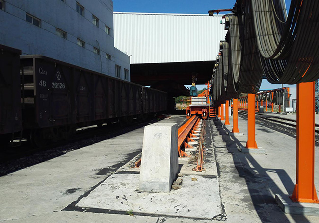 裝卸場共設(shè)6股道,其中卸煤區(qū)配3股道,分別為重車線、空車線和機(jī)車走行線,東端盡頭處設(shè)翻車機(jī)1臺(tái),與廠區(qū)輸煤系統(tǒng)連接。裝車區(qū)配2股道,分別為貨物線及到發(fā)線,配貨物站臺(tái)及雨棚等設(shè)施,與產(chǎn)品包裝倉庫連接。另設(shè)機(jī)車整備及車輛臨修線1條,滿足機(jī)車及車輛檢修要求。