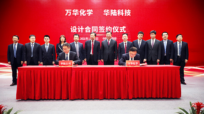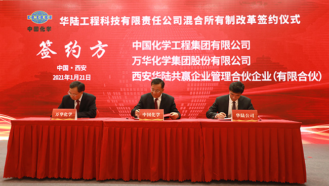 2021年1月21日,中國化學華陸公司混合所有制改革簽約儀式在西安舉行,標志著華陸公司混合所有制改革工作邁出關鍵步伐,落實國企改革三年行動取得新成效。中國化學黨委書記、董事長戴和根,萬華化學黨委書記、董事長廖增太出席簽約儀式并講話。中國化學黨委副書記劉德輝、萬華化學高級副總裁劉博學出席簽約儀式。華陸公司黨委書記、董事長王海致辭,總經理康建斌主持簽約儀式。