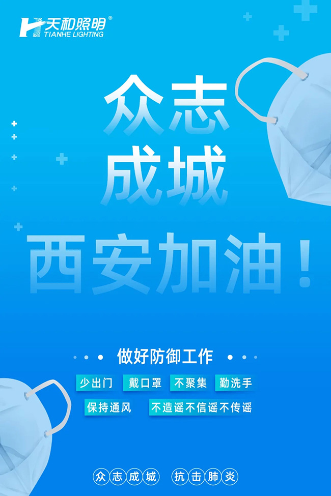 疫情防控關乎著每個人的生命健康安全,天和照明將繼續(xù)履行企業(yè)職責和社會擔當,以綿薄之力為抗擊疫情而積極努力。