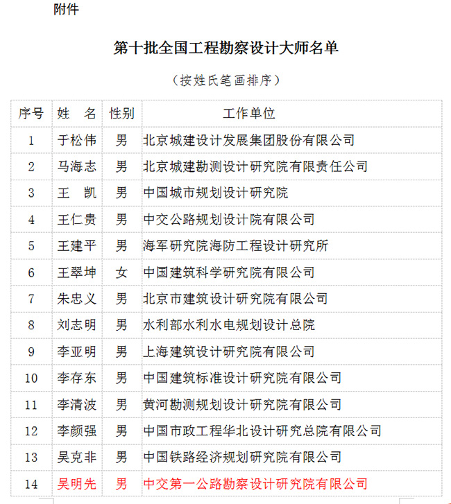 根據《全國工程勘察設計大師評選與管理辦法》(建質規(guī)〔2019〕4號),我部組織開展了第十批全國工程勘察設計大師評選工作。經審定,決定授予于松偉等35名同志全國工程勘察設計大師稱號,現予公告。